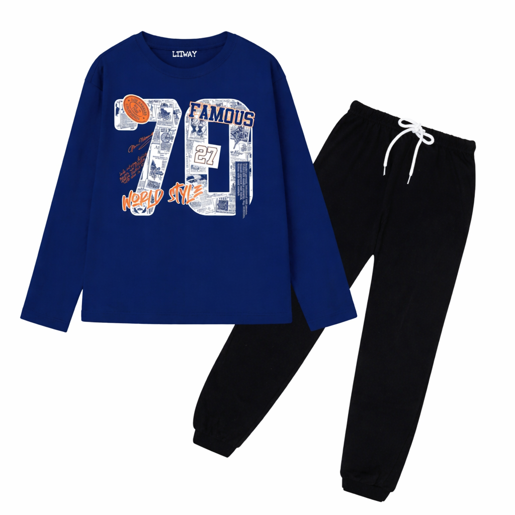 Bring together comfort and cool everyday style with this boys’ full sleeve T-shirt and pant combo. Designed for boys aged 9 to 16 years, this set is perfect for active days and relaxed moments. The navy blue T-shirt features a bold “70” graphic with text elements that add a sporty, street-inspired look, while the solid black pants keep the outfit versatile and easy to wear for different occasions.