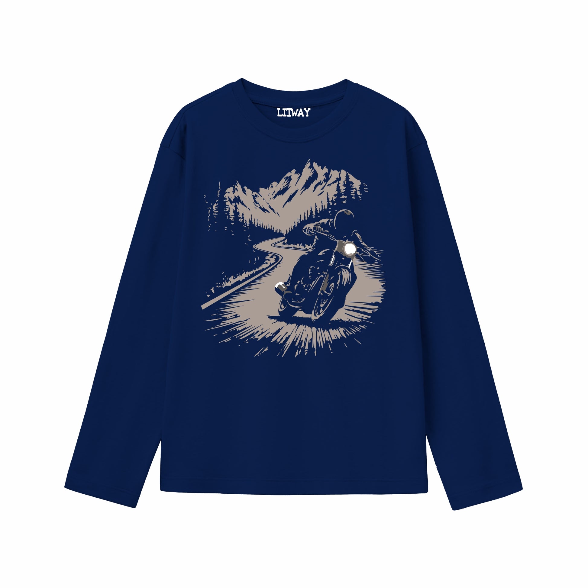Designed for boys who enjoy comfort with a touch of adventure, this full sleeve T-shirt and pant combo delivers everyday style and ease. The navy blue T-shirt features a bold motorcycle and mountain-inspired graphic that brings an outdoor, explorer vibe, while the solid black pants add a clean and versatile finish. It’s a ready-to-wear outfit that works well for school days, casual outings, and relaxed weekends.