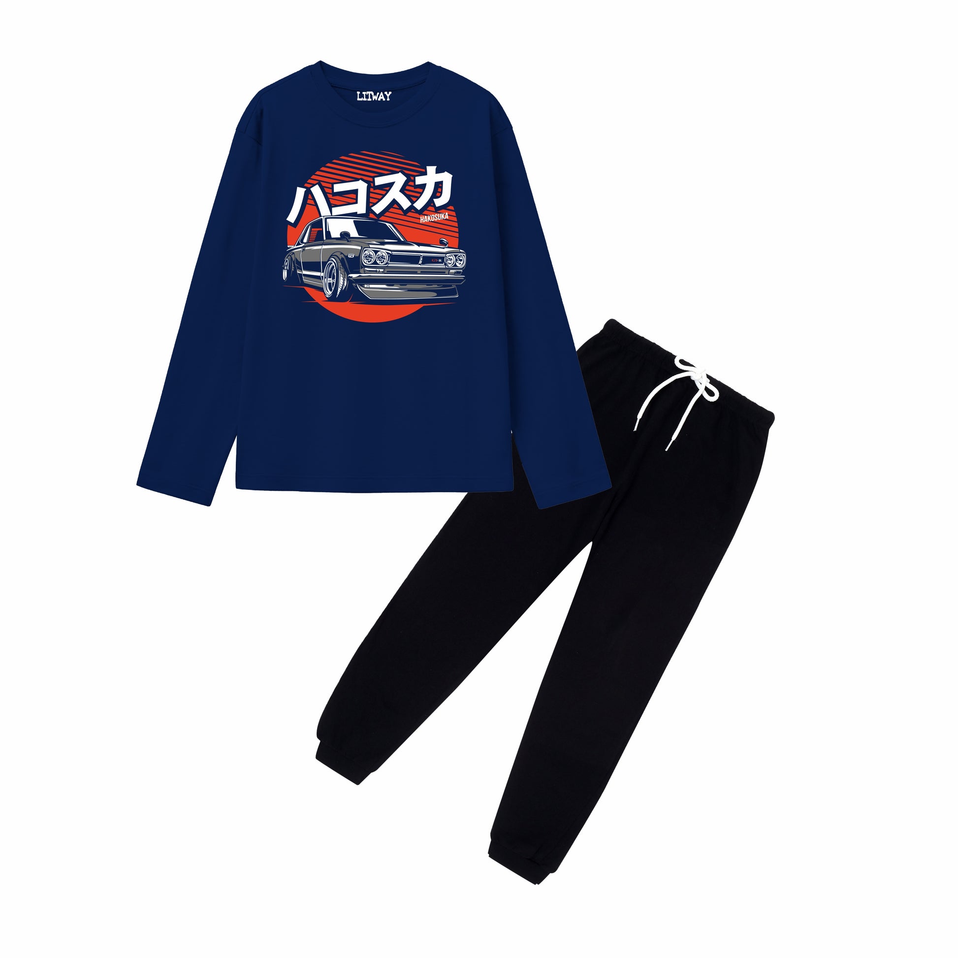 Add a cool, street-inspired edge to everyday dressing with this boys’ full sleeve T-shirt and pant combo. The navy blue T-shirt features a bold car-themed graphic with stylish text elements that bring a modern, urban vibe, while the solid black pants balance the look for easy styling. Designed for boys aged 9 to 16 years, this set is a comfortable and practical choice for daily wear.